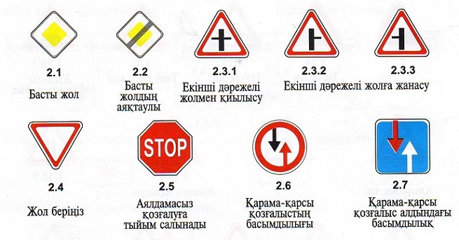 Басымдылық белгілері. Басымдылық белгілері көше қиылыстарын, жолдың жіңішкерген бөлігін, кесіп өту кезектілігін белгілейді. Олар пішіндері мен түстері әр түрлі 9 жол белгілерінен тұрады.