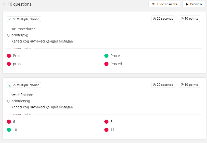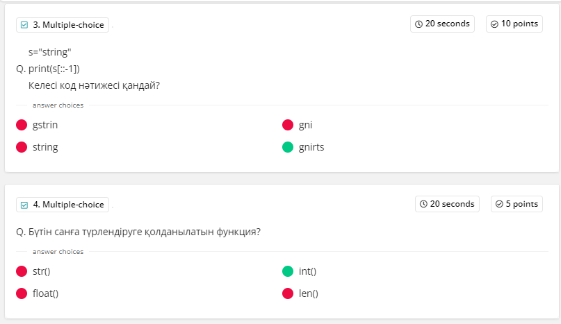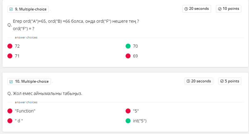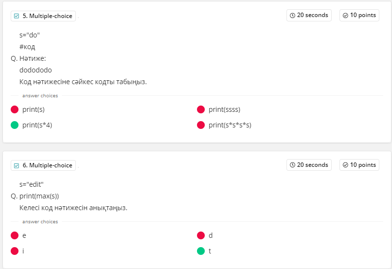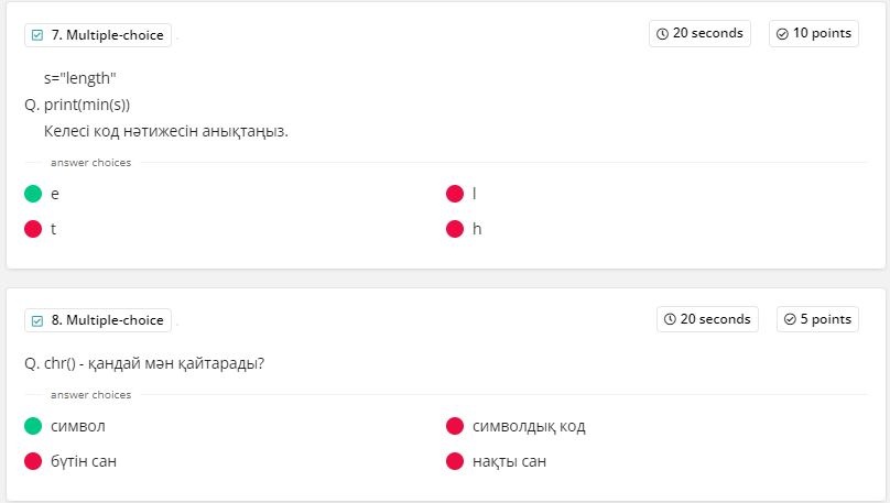 Қалыптастырушы бағалау ұйымдастыру. Оқушыларға практикалық тапсырмаларды беру. Бағалау критерийлері: А деңгейі – 5 балл +B деңгейі - 8 балл +С деңгейі – 10 балл Топтық қосымша балл: 2 балл – үздік топ 1 балл – екінші топ 0 балл – соңғы топ А - деңгейі Quizizz тест – жолдық функциялар қолдану нәтижелерін анықтау. Топтық жарыс. https://quizizz.com/admin/quiz/62c701a6d989ba001eac6705?source=quiz_page Дескриптор: