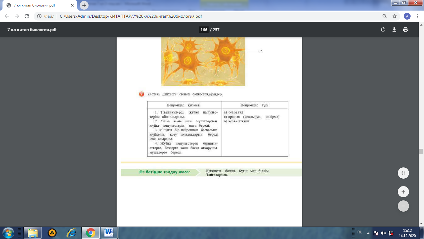 7.1.7.2 - жүйке жүйесінің қызметін және құрылымдық компоненттерін атау; 7.1.7.3 - жүйке жасушасының компоненттерін анықтау |