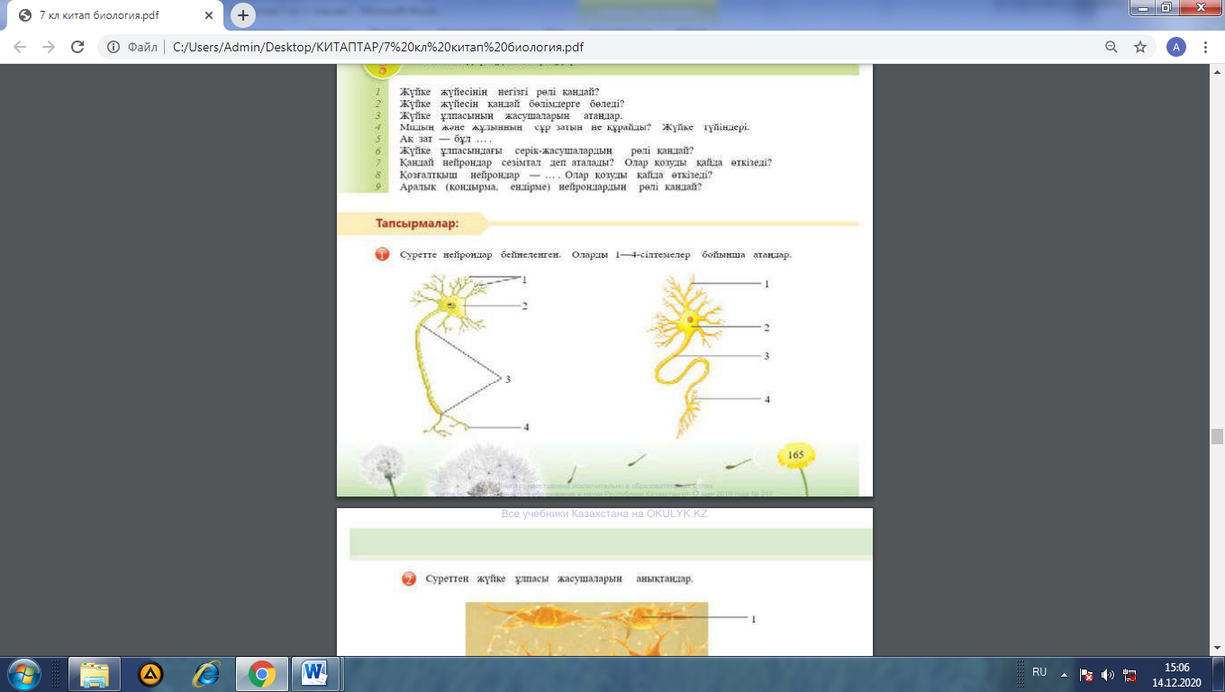 1-Тапсырма 1.Суретте нейрондар бейнеленген. Оларды 1-4 сілтемелер бойынша атайды. 2.Суреттен жүйке ұлпасы жасушаларын анықтайды.