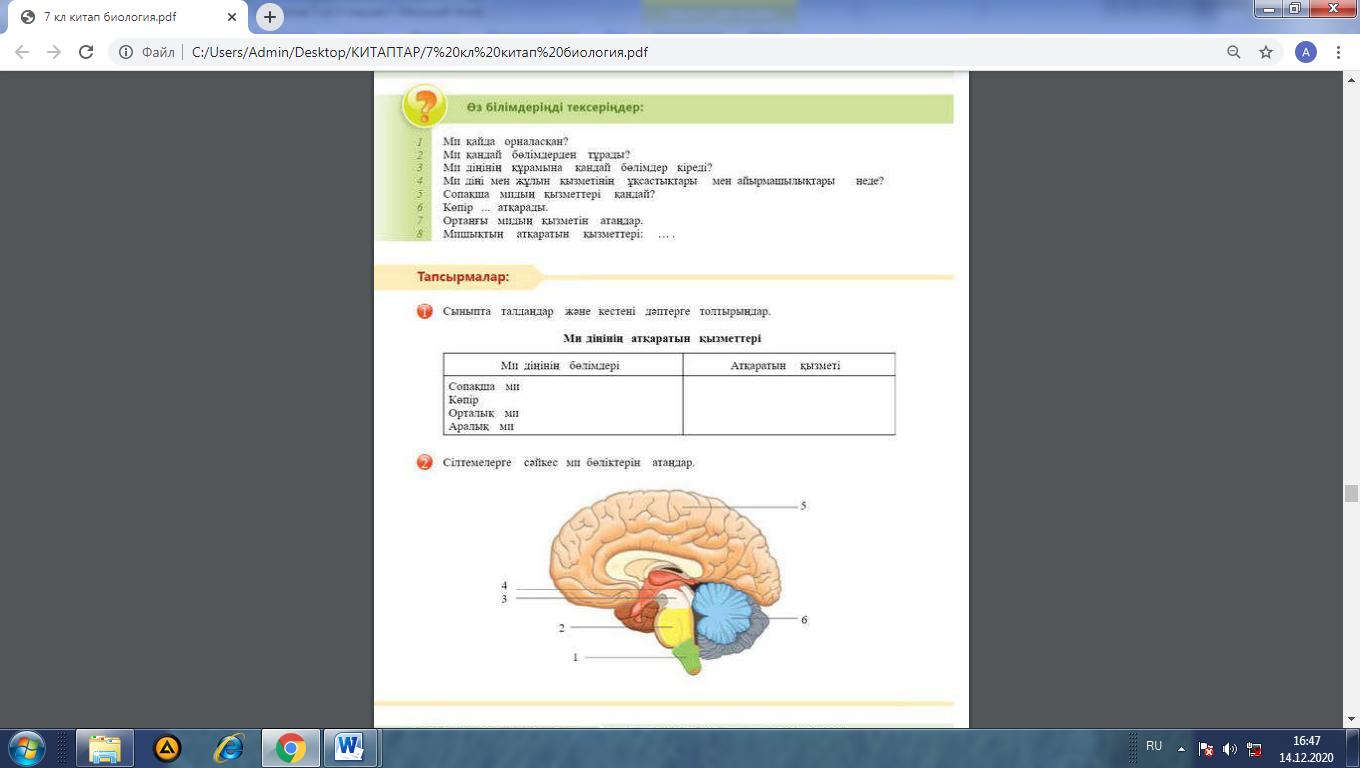 2.Суреттегі сілтемелерге байланысты ми бөлімдерін атайды. Дескриптор: Жалпы - 3 балл 1.Кестені толтырады және қызметтерін талдайды. 2. Суреттермен жұмыс жасайды, сілтемелерді атайды. |