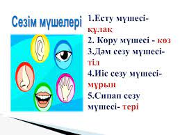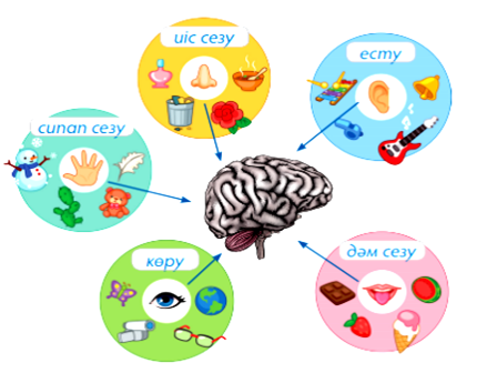 заттардың атауын тапты. Яғни,иіс сезу,есту,сипап сезу,көру арқылы,дәм сезу арқылы адам айналадағы заттар мен құбылыстарды сезім мүшелері арқылы қабылдайды.