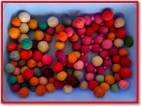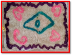 Балабақшада жүн бұйымдарының суреттерін, шағын үлгілерін көрсету арқылы балаларға ұлттық қолөнер туралы түсінік беруге болады. Ою-өрнектерді қарау, түстерді ажырату арқылы балалардың эстетикалық талғамы қалыптасады.Келесі суреттерде балалардың өздері жасаған бұйымдары.