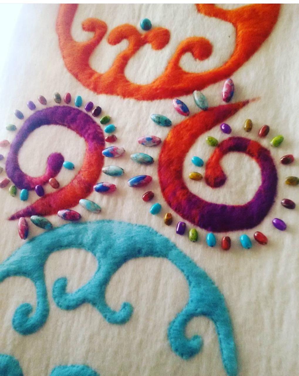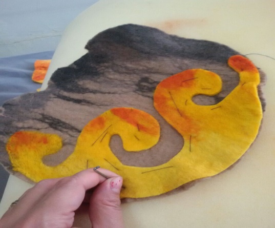 Пайдалануға ыңғайлы.Сулы түрде басу бұл ежелгі киіз басу әдісі. Қазіргі таңда жүнді сабынды сумен ысқалау және илеу арқылы жүн талшықтарын біріктіру кең қолданысқа ие.1кезең жұмыс орнымызды дайындамыз. Су өтпейтін төсеме төсейміз.Жылы су мен сабынды дайындаймыз. Киімге үйлесетін түс жүндерден төсеме мата шала басылады,кепкен соң ұрғақ жүнді фильцтеу әдісі (арнайы инемен) кең танымал болып тұр.Себебі бұл тәсілмен үйде де сыныпта да ою қырқып алынады(суретте көрсетілгендей