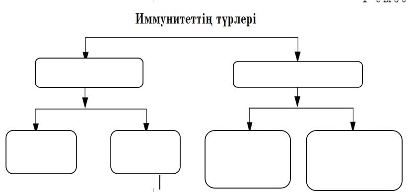 Сабақты бекіту тапсырмалары. Оқушылармен жұптық, жеке жұмысты ұйымдастырады, бақылау жасайды, ЕБҚ оқушыға қолдау көрсетеді. 1-тапсырма «Сөйлемді аяқта!» тәсілі Табиғи иммунитет --------------- және ----------бөлінеді. Табиғи пайда болған --------------- бір аурумен ауырған соң қалыптасады. Жасанды иммунитет медициналық препараттар: ------------ немесе --------------енгізілген соң пайда болады. ---------------бұл тіршілігін жойған немесе әлсіздендірілген ауру қоздырғышы не оның уы. ------------------- емдік сарысу енгізілген соң пайда болады. Тірек сөздер: иммунитет, Вакцина, туа біткен, жүре пайда болған, емдік сарысу , Жасанды енжар иммунитет, вакцина 2-тапсырма Сызбанұқсаны толтырыңдар (ЕБК бірге)