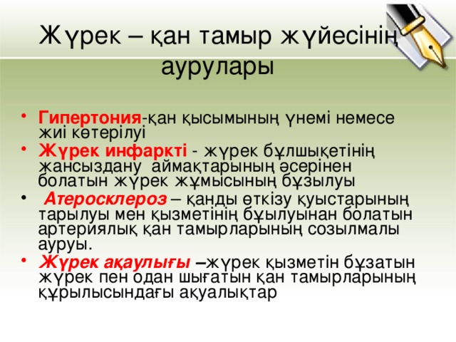 Оқушылар орындай алады: Жүрек - қантамырлар жүйесі аурулары (гипертония, инфаркт, ишемиялық ауру, атеросклероз, инсульт). Аурудың себептері: тұқымқуалаушылыққа бейімділік, теріс өмір салты, дұрыс тамақтанбау Пәнге қатысты лексика мен терминология «қантамыр жүйесі ауруларының себептері мен ауру белгілерін сипаттау Диалог құруға / жазылымға қажетті сөздер топтамасы