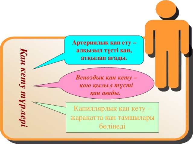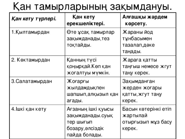 Жүректің құрлысы мен қызметін анықтай алады. Қан тамырлар мен жүрекке сипаттама бере алады. Тапсырманың құндылығын анықтайды. Қан кету түрлерін ажырыта білуге үйрету, журек-қан тамырлар жүйесінің ауруларынын анатомиялық физиологиялық түсініктеріді зерттейді Денсаулықты сақтауда және жүрек-қан тамырлары ауруларының алдын алуда жүректі жатықтырудын мақызын көрсетеді |