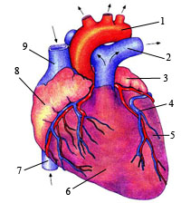 1 – қолқа доғасы; 2 – өкпе артериясы; 3 – сол жақ жүрекше; 4 – қантамырлары; 5 – сол жақ қарынша; 6 – оң жақ қарынша; 7 – төменгі қуысты вена тамыры; 8 – оң жақ жүрекше; 9 – жоғары қуысты вена тамыры; бағдарша (стрелка) қанның ағу бағытын көрсетеді
