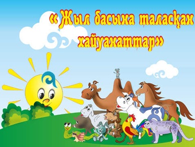 тұрайық Тәрбиеші: Жыл басына таласқан хайуанаттар сіздер таң атып, күн шыққанша уақыт көп,ойын сауық құрайық! Осы ертегіде неше жануар болса соны үш тілде атап берейікші. Жылқы- лошадь- хорс Түйе – бервлюд – кэмл Сиыр – корова – кау Қой- овца – шип Ит – сабака - дог Тауық – курица – хэн Тышқан – мышка - маус
