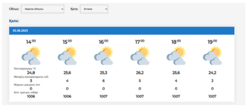 1 топ тапсырмасы. Наукастинг бойынша бүгнг күннң ауа райы болжамын жаз. Төменде КАЗГидроМед слтемесн пайдалан. Осы ақпаратты пайланып кесте жасап толтыр