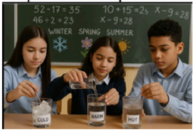 Жыл мезгілдеріне байланысты натурал сандар, өрнектер және теңдеулер арқылы судың үш түрлі күйін (суық, жылы, ыстық) зерттейтін практикалық жұмыс. Бұл STEM элементтерімен үйлескен құбылысты математикалық жолмен сипаттауға арналған тәжірибе.