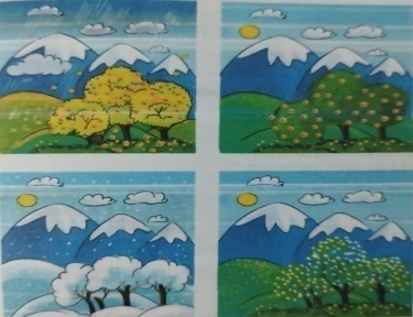Балалар біз ненің суретін көріп тұрмыз? (Дұрыс айтасыңдар балалар, демек бүгінгі тақырыбымыз «Жылдың төрт мезгілі» деп аталады) яғни орысшада «Четыре времени года»