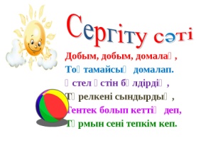 Дос болайық бәріміз, Жарасып тұр сәніміз. Тыныштықты сақтаймыз, Сабақты біз бастаймыз!