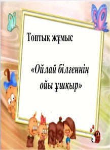Мұғалім оқушыларды топпен жұмыс жасауға, сын тұрғысынан ойлау дағдысын қолданып пікрін білдіруге баулиды. 10-тапсырма Жеке жұмыс Мұғалім оқушыларға бағыт- бағдар береді. Тапсырма Жеке жұмыс |