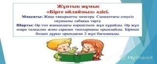 Мақсаты: Оқушылар бір-біріне тілек білдіреді, тыңдау дағдыларын дамытуға бағытталады, сондай-ақ барлық оқушылардың қатыстырылуы арқылы сабаққа белсенділігі артады. |