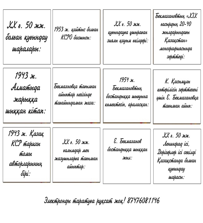 Зерттеу сұрағы: «Хрущевтік жылымық» кезінде қоғамда қандай өзгерістер болды? Өткенді еске түсіру: Оқушылар осыған дейінгі білімдеріне естеріне түсіп, репрессиялардың себептері мен салдарларын. Репрессияға ұшыраған топтарды атайды (зиялылар, орта тап, депортацияланған халықтар, тұтқында болған әскери адамдар және т.б. әлеуметтік топтар) Ұяшықтағы сұрақтар әдісі