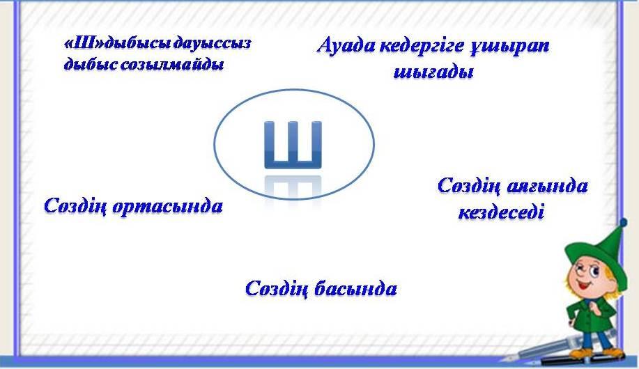 1.2.9.1 Әріпті тану, ажырату және оны дыбыспен сәйкестендіру. 1.2.1.2 Оқудың түрлерін (буындап оқу, жиі кездесетін сөздерді тұтас оқу, түсініп оқу) қолдану. 1.1.9.1 Сөздегі дыбыс түрлерін (дауысты, дауыссыз) ажырату және дұрыс дыбыстау 1.1.9.3 Сөздің буыннан тұратынын түсіну және сөздегі буын санын анықтау 1.3.8.1 Жазу жолын, жоларалық кеңістікті, жолдың жоғарғы және төменгі сызығын сақтап, әріп элементтерін каллиграфиялық талаптарға сай жазу. |