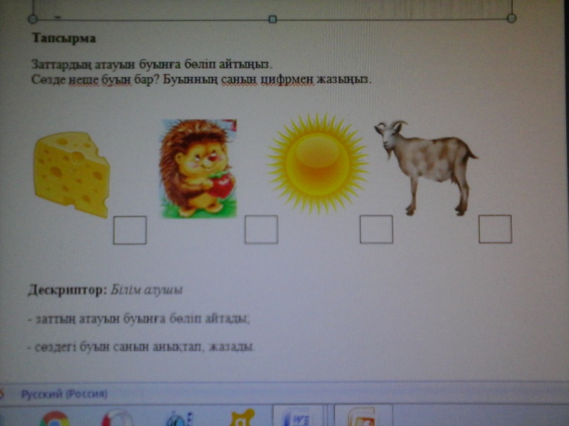 Дескриптор: Білім алушы - заттың атауын буынға бөліп айтады; - сөздегі буын санын анықтап, жазады. Оқушыларға кері байланыс беремін: Жарайсың! Керемет!
