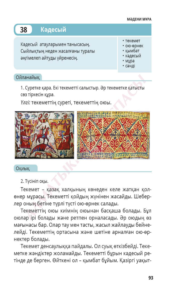 Текемет Ою-өрнек Қымбат Кәде Дәптерлеріне жазады Екі текеметті салыстырады. Әр текеметке сөз тіркесін құрады. Текеметтің оюы, текеметтің суреті |