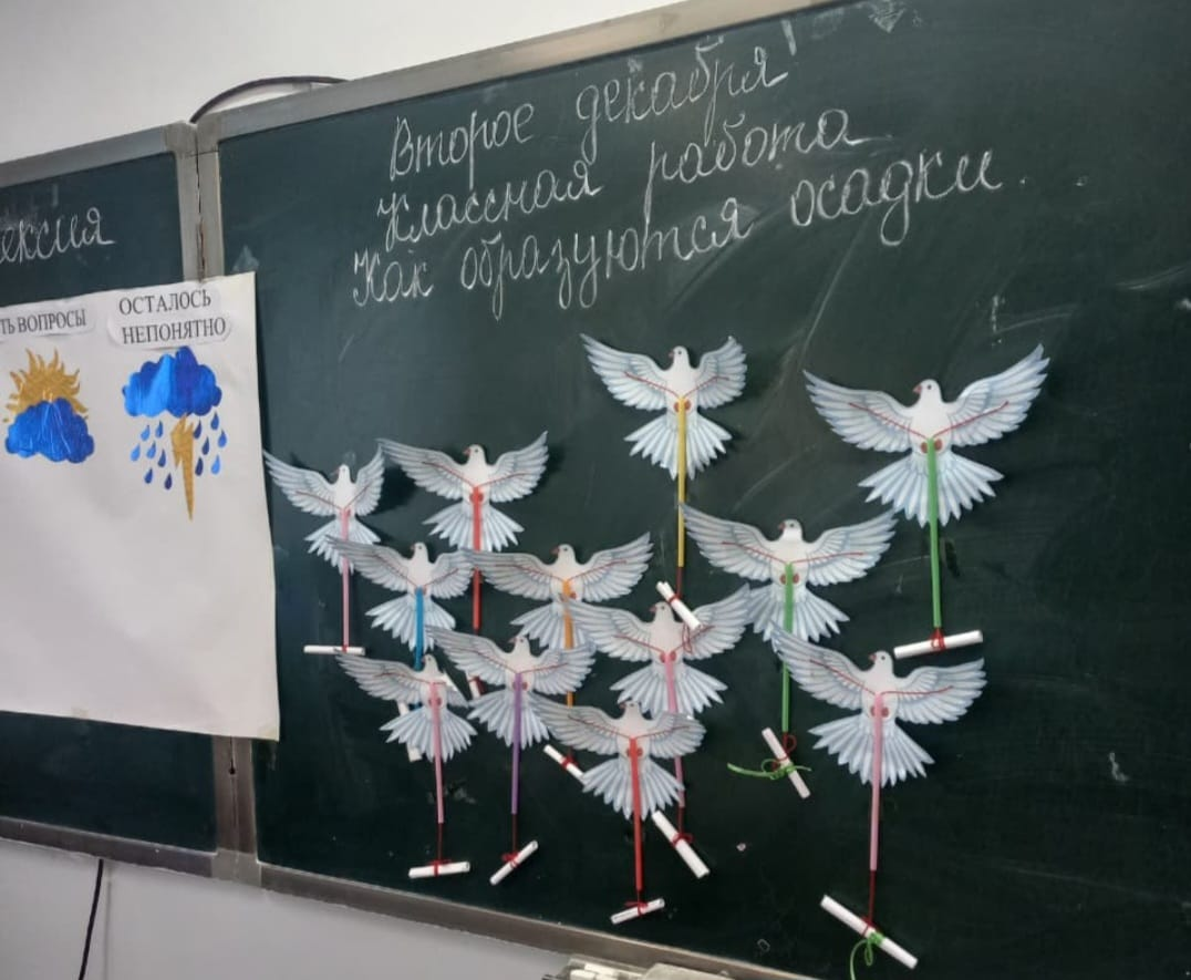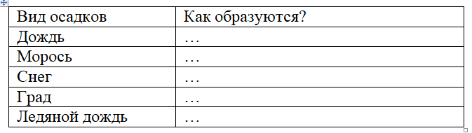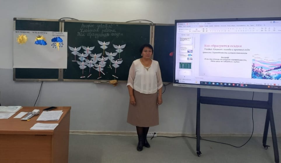 Организационный момент Приветствие. -Добрый день, ребята! Готовы погрузиться в мир русского языка? Проверка посещаемости и готовности учащихся. Проверка домашней работы Актуализации знаний -Отлично! Вы справились. Мы назвали разные явления природы: дождь, снег, роса, град, иней. Но задумайтесь: почему они появляются? Откуда берутся белые «мухи» снежинки? Как капли росы оказываются на траве, хотя ночью дождя не было? Почему иногда идёт дождь, а иногда град? Чтобы ответить на эти вопросы, нам сегодня предстоит открыть очень интересный природный процесс. Тема урока: Как образуются осадки. 2.Изучение нового материала Как образуются осадки Осадки это вода, которая выпадает из облаков на землю. Они бывают разными: дождь, снег, град, морось. Чтобы появились осадки, в воздухе должен быть водяной пар- это вода в виде газа. Он образуется, когда вода испаряется с поверхности рек, морей, луж или с земли. Когда воздух становится влажным и насыщается водяным паром, дальше он уже не может удерживать больше влаги. Если воздух охлаждается, водяной пар превращается в маленькие капельки воды или кристаллики льда. Так формируются облака. Внутри облака капельки воды и кристаллики льда сталкиваются и соединяются, становятся крупнее. Когда они становятся слишком тяжёлыми, они выпадают на землю так появляются осадки. Виды осадков: Дождь - жидкие капли воды. Если капельки маленькие, идёт морось. Снег твёрдые осадки. Снежинки это льдинки, которые соединяются друг с другом. Град кусочки льда. Он появляется в грозовых облаках, когда капли воды быстро замерзают. Ледяной дождь дождевые капли, которые замерзают при падении на холодную землю.