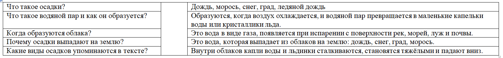 -понимают основную информацию сообщения продолжительностью 2–4 минуты, определяя ключевые слова и фиксируя главные сведения; -используют различные виды чтения, включая изучающее и выборочное, для поиска нужной информации в тексте; -анализируют содержание текста о процессе образования осадков, связывая новые знания с собственным опытом и наблюдениями; |