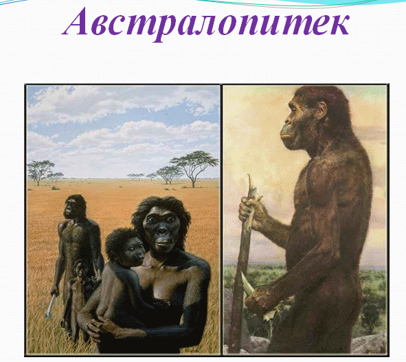 : Австралопитеки – южные обезьяны. Первые их останки были найдены в пустыне Калахари в Южной Африке. Жили в степи и лесостепи, где особую роль играли глаза и умение стоять прямо, чтобы вовремя заметить хищника. Процесс становления человека проходил в эпоху резких климатических изменений, когда в корне менялась вся окружающая среда. Отступление лесов и наступление степей вынуждало чаще все чаще прибегать к ходьбе на двух ногах, приучало к выпрямленному положению тела. Челюсти у них были гораздо массивнее, чем у человека, лицевой отдел черепа-небольшой, а тяжелые надбровья нависали над глазницами. Обороняясь от хищников,они использовали камни, палки, которые находили на земле. Сами изготавливать орудия труда не умели. Человек умелый – вероятно, жил одновременно с австралопитековой обезьяной, которая являлась для него такой же добычей, как и другие животные. Ученые считают, что они жили бок о бок в течение примерно 2-х миллионов лет. Человек умелый имел рост 140 см и средний вес 40 – 50 кг. Большой палец руки еще не был противопоставлен остальным пальцам, т.к. был достаточно коротким. Древнейшие люди - к ним относится питекантроп, или обезьяночеловек, его рост составлял 175 см, т.е. он был гораздо выше человека умелого. Также выделяют важного представителя питекантропа – синантропа. Его рост был примерно 150 см, он имел крупную голову с развитым надглазничным валиком. Питекантропы и синантропы относятся к человеку прямоходящему. Ученые установили, что жили они в коллективах из 3-6 взрослых мужчин, 6-10 женщин и 15-20 детей разного возраста. Жизнь такого сообщества невозможна без общения, поэтому у них была примитивная речь из небольшого набора сигналов – понятий. Хотя голосовой аппарат их не был таким мощным и гибким как у современного человека, но он позволял издавать более сложные звуки (речь похожая на лепет), чем просто бормотание и визги современных обезьян. Важную роль играли мимика и жесты. Человек не являлся большим и мощным хищником, способным охотиться в одиночку, поэтому охота на добычу проходила коллективно и требовала хитрости и слаженности в действиях. Человек прямоходящий научился сам изготавливать орудия. Также он научился замечать сезонные миграции животных и сам перемещался вслед за ними, поэтому он уже мог запоминать ориентиры и, уйдя далеко от стоянки, находил путь обратно. Особую роль сыграло использование огня, который сделал человека независимым от климата и позволил расселиться по поверхности Земли. Однако, он не умел сам добывать огонь, он научился только поддерживать его.. Современные люди – некоторые ученые считают, что они произошли одновременно в разных концах Земного шара, другие ( и это предпочтительная версия) – что в одном месте и постепенно заселили Землю. Ископаемые были названы кроманьонцами. У них была прямая походка, рука приобрела возможность совершать точные и ловкие движения, изготавливать сложные орудия труда и с их помощью строить жилье. Человек научился не просто носить шкуры животных, но шить из них одежду, защищаясь от холода и мошки. К этому виду людей относимся и мы с вами, и наше видовое название Homo sapiens. В течение всего этапа становления человека как вида существенно менялся такой важный параметр в строении как объем мозга (а не его масса), который свидетельствует о прогрессивном развитии ин