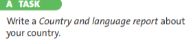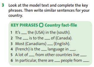Ss look at the model text and complete the key phrases. Then write similar sentences for your country . Ss should writing and draw the picture about Canada in the card. Ss should write country and language report about your country. Ss should write the answers in the cards. |