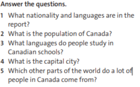 Understand the main idea of the new text; Read for general meaning and specific detail Read a text about Country and language report Canada Ask and answer the questions . |