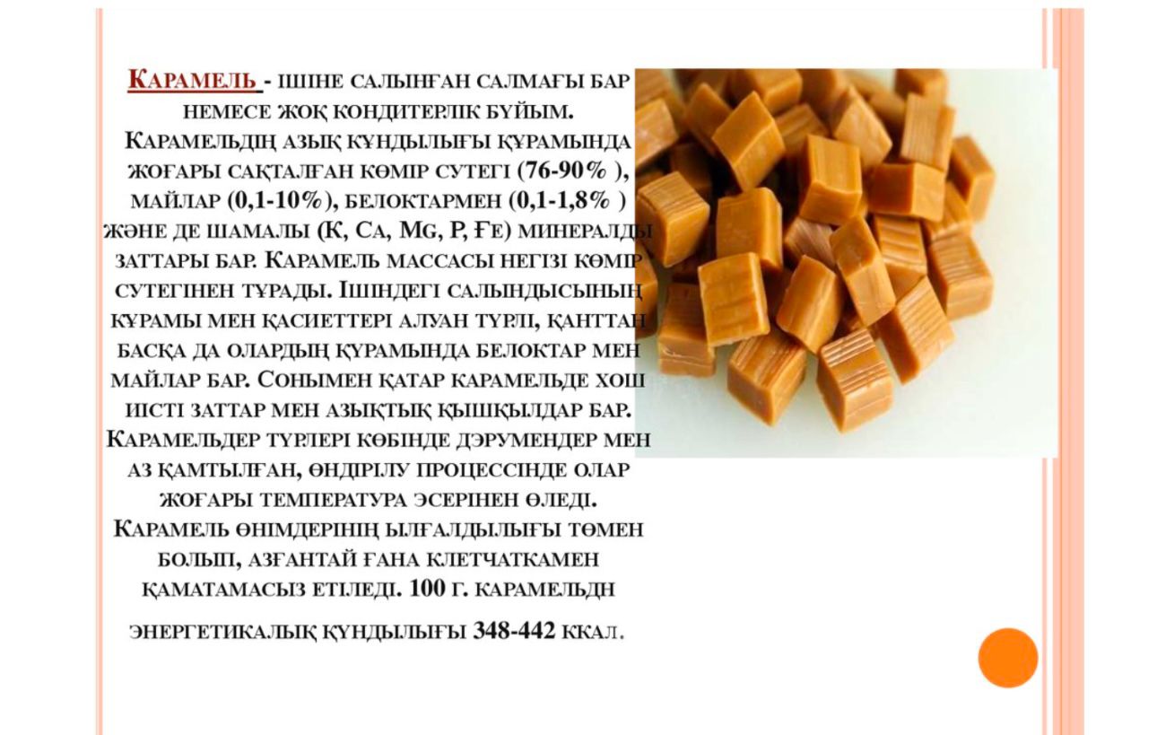 Өткен тақырыпты қайталау. -Қоғамдық тамақтандыру кәсіпорындарының қандай түрлерін білесіздер? -Қоғамдық тамақтандыру кәсіпорындарында қандай қауіпсіздік ережелерін сақтау керек? Теориялық бөлім: Карамельдің түрлері мен тарихы: қантты, сүтті, шоколадты карамель. Карамель дайындаудың негізгі ингредиенттері: қант, глюкоза, су, сары май, сүт, хош иістер. Карамель дайындаудың технологиясы: 1. Құрамды ингредиенттерді дайындау. 2.Қайнатып, араластыру. 3.Температураны бақылау. 4.Қажетті консистенцияға келтіру. 5.Формалау және салқындату. Карамельдің сапасы мен оның ерекшеліктері. |