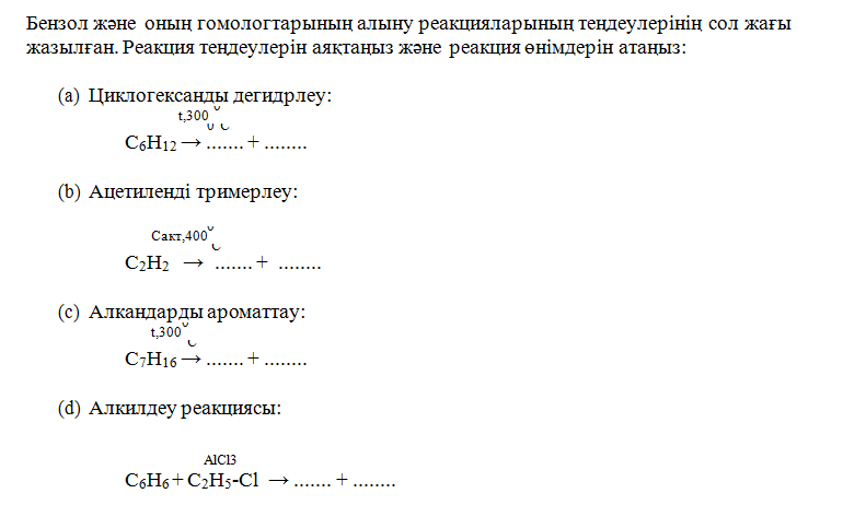 Тапсырма №1: Бензол және оның гомологтарының алыну реакция теңдеулерін аяқтап, реакция өнімдерін атайды