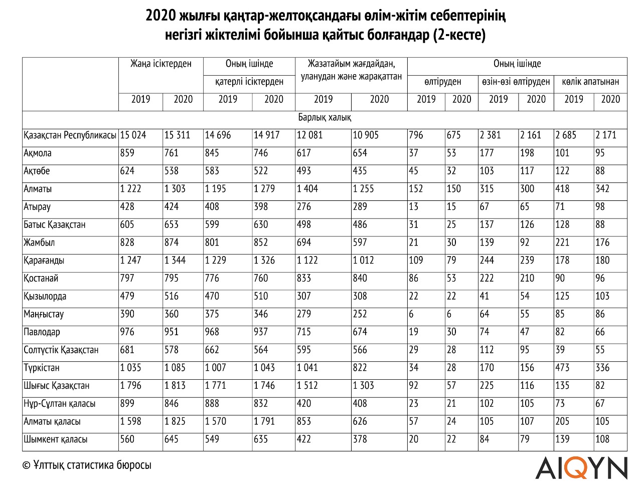 1.1 кесте. 2019-2020 жылғы ұлттық статистика бюросы бекіткен, Жазатайым жағдайдан, уланудан сонымен жарақаттан және көлік апатынан қаза тапқан адамдардың республикалық тізімі келтірілген.