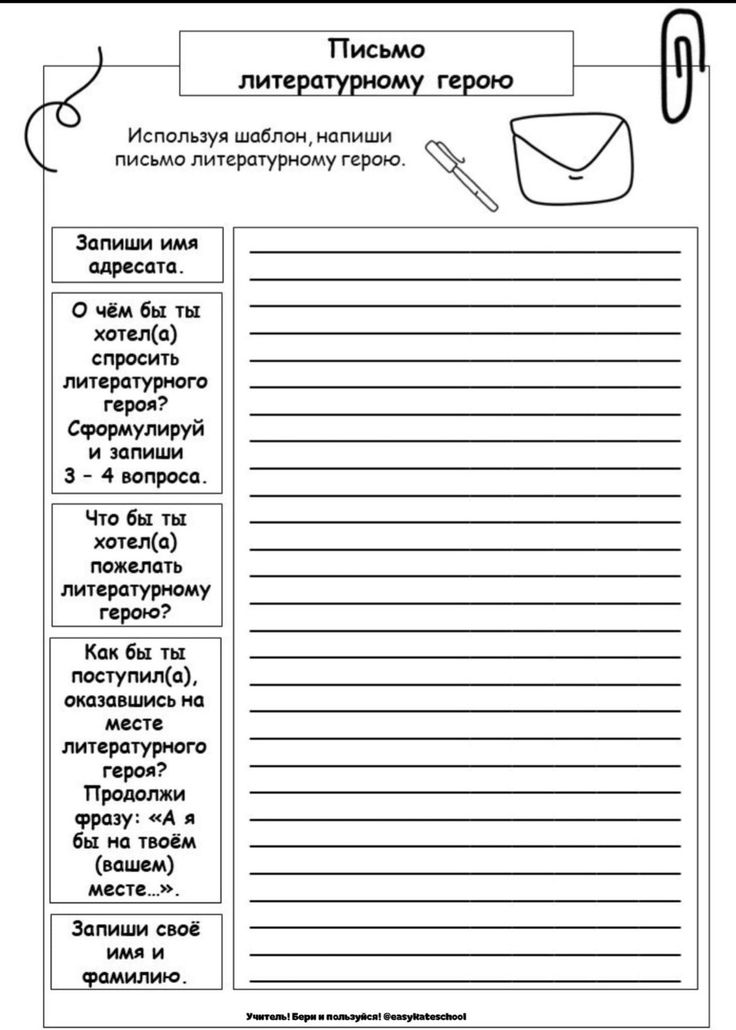 Әдебиеттік оқуда мәтіндегі кейіпкерге хат жазуға арналған жұмыс парағы
