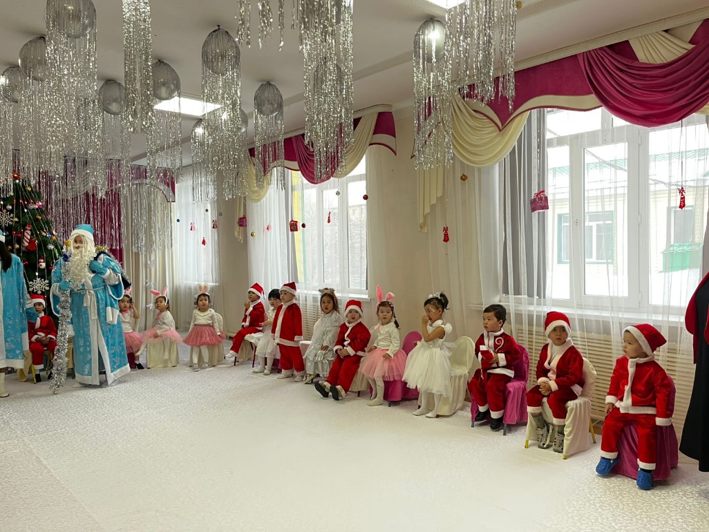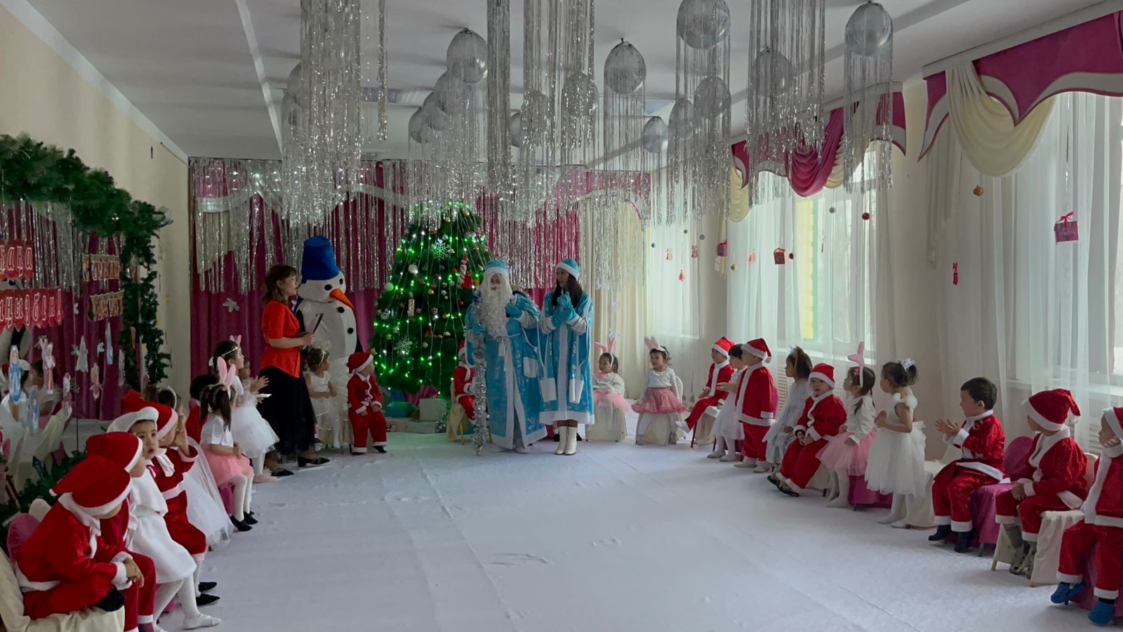 Жүргізуші:Балалар айналаға қараңдаршы,бүгін залдың іші әдемі болып тұр.Төрде жарқыраған шамдар,ойыншықтармен безендіоілген шырша тұр.Біз қандай мерекеге келдік.