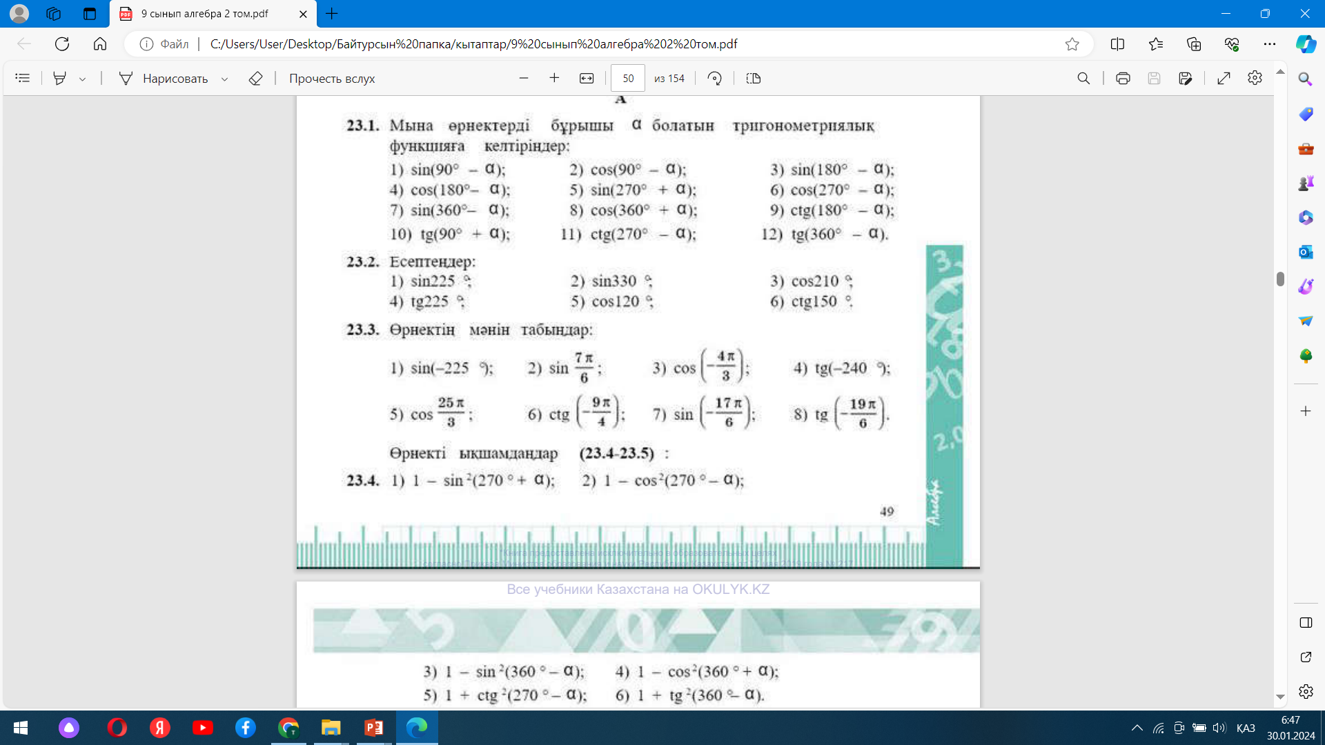 Оқушыларға сүйір бұрыштың тригонометриялық функциясының әрбір бұрышындағы синустыың, косинустың, тангенстің, котангенстің келтіру формулаларымен таныстыру, осы формулаларды тригонометриялық өрнектерді түрлендіруде және есептерді шығару кезінде қолдануды үйрету; |