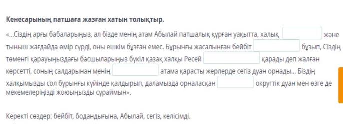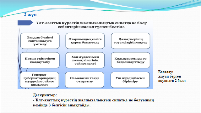 Оқушылар жұпқа бөлініп, тапсырманы орындайды. Дескриптор: -1837 ж. болған оқиғаны анықтайды; -1838ж. болған оқиғаны анықтайды; -1841 ж. болған оқиғаны анықтайды. Дескриптор: -Ұлт-азаттық күрестің жалпыхалықтық сипатқа ие болуының кемінде 3 белгісін анықтайды.