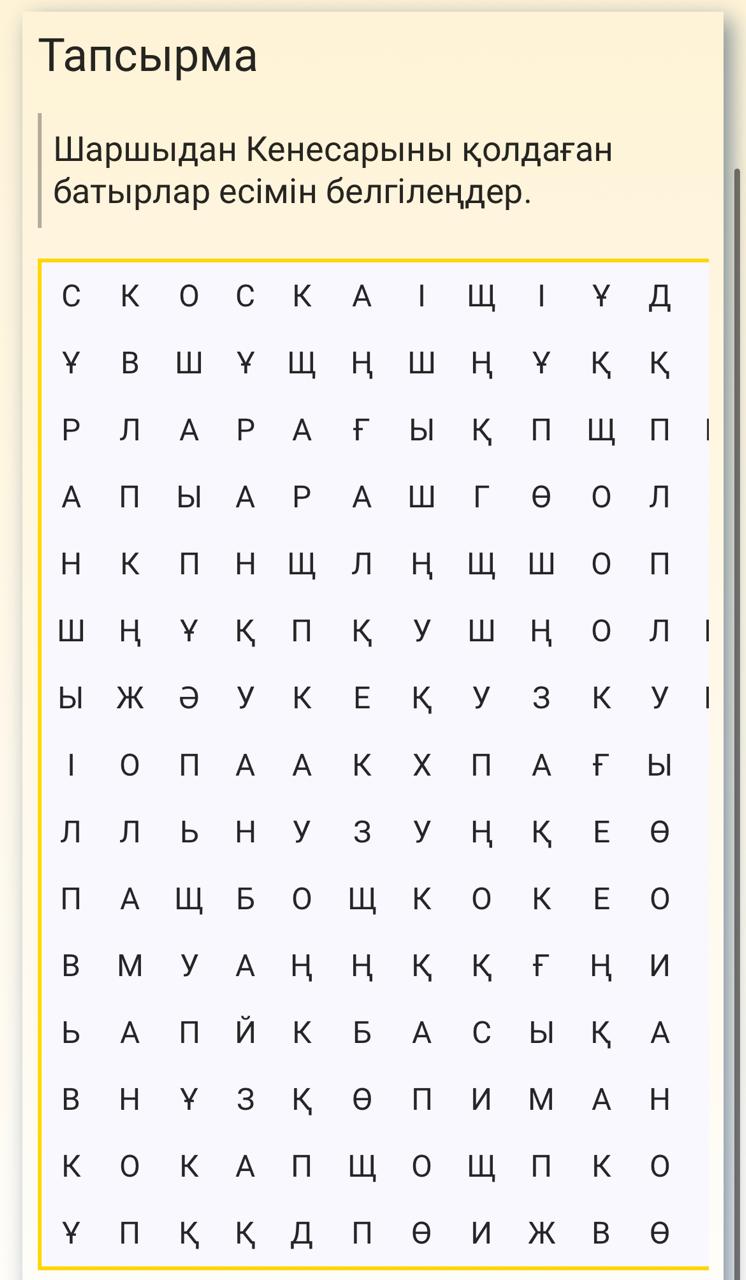 3-тапсырма. Жеке жұмыс. Тақырыптын соңындағы берілген кюар кодты ашып, Кенесарыны қолдаған батырларды тауып сәйкестендіреді (Кітаппен жұмыс)