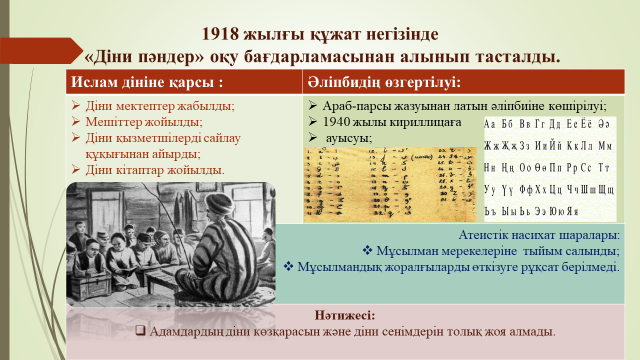 Мұсылмандық жоралғыларды өткізуге рұқсат берілмеді Нәтижесі: Адамдардың діни көзқарасын және діни сенімдерін толық жоя алмады.