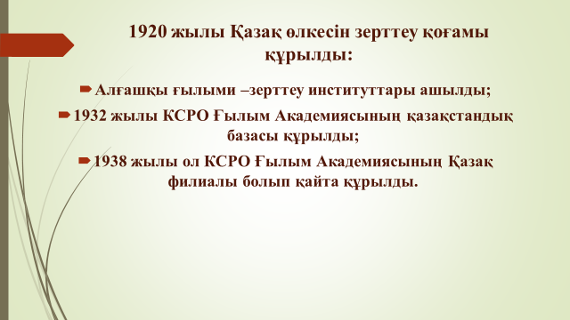 Қазақстандық қордың , содан кейін КСРО ҒА -ның филиалын құруға байланысты ғылыми -зерттеу жұмыстарын ұйымдастыру мен үйлестіру жұмысы жақсарды. Тарих, лингвистика, геология, химия т.б. салалар елеулі жетістіктерге жетті.
