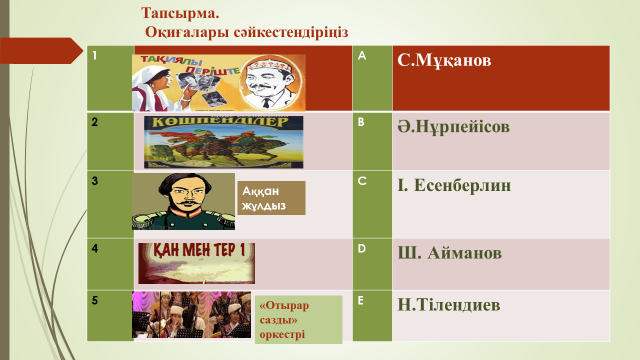 1.2. Суреттерде берілген тұлғаларды анықтаңыз: А)Ә. Бөкейхан, А. Байтұрсынұлы, М. Шоқай, Қ. Сәтбаев; В) М. Жұмабаев, А. Байтұрсынұлы, Ә. Бөкейхан, Ш Құдайбергенұлы; С) А. Байтұрсынұлы, С. Асфендиаров, Қ. Сәтбаев, Ә. Бөкейхан; Д) Ж. Аймауытов, С. Асфендиаров, Қ. Сәтбаев, Ә. Бөкейханов; Е) А. Байтұрсынұлы, Ж. Аймауытов, С. Асфендиаров, Қ. Сәтбаев. 1.3. Суреттерде берілген тұлғалардың құрастырған оқулығын анықтаңыз: А) Төте жазу, Қазақстан тарихы, алгебра, география; В) Қазақстан тарихы, астрономия, география, төте жазу; С) Биология, география, физика, төте жазу; Д)Химия, қазақстан тарихы, биология, қазақ тілі; Е)Төте жазу, Қазақстан тарихы, орыс тілі, география. Жауабы. 1.1- В) Төртеуі де қазақ тілінде оқулықтарды құрастырды 1.2.- С) А. Байтұрсынұлы, С. Асфендиаров, Қ. Сәтбаев, Ә. Бөкейхан. 1.3.- А) Төте жазу, Қазақстан тарихы, алгебра, география. Кілт сөздер: Қазақ әдебиеті, социалистік реализм, театр, опера, өнер.