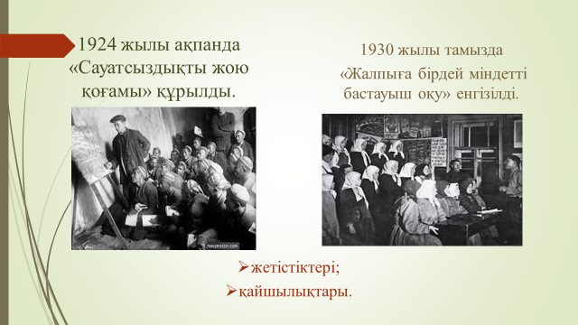 1917 жылғы қазан төңкерісінен кейін Қазақстанда мәдени өзгерістердің басты бағыты сауатсыздықты жою мен ағарту ісін дамытуға бағытталды. Ой түрткі: