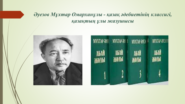 2.Шығармашылығы социалистік реализм шеңберінен шығып, модерндік сипат алған қазақтың ұлы жазушысы , қазақ әдебиеті тарихында ерекше орын алған М. Әуезов шығармасына талдау жасалады.