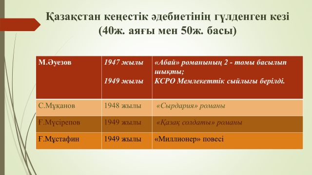 3. 60-80 жылдарда социалистік реализм стилінде жазуды жалғастырған жазушылардың тарихи романдарына талдау жасалады.