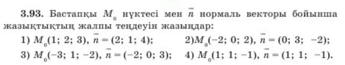 4. нүктесі мен нормаль векторы бойынша берілген түзу теңдеуін жазыңдар: (6;4;0) , (-10;0;14)