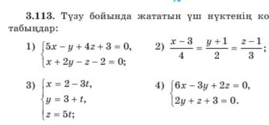 3. және нүктелері арқылы өтетін түзу теңдеуін жазыңдар: (-4;12;-4) және (8;0;-2) (6;0;-24) және (-6;-4;0) |