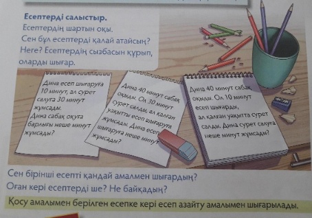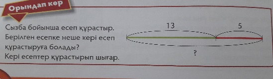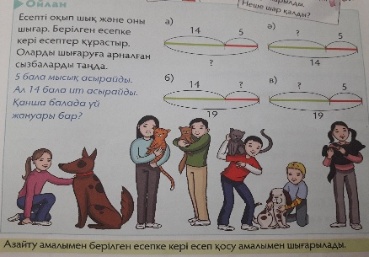 1.5.1.1. есепті сызба, сурет, қысқаша жазба түрінде модельдеу; есепті шешу үшін тірек сұлбаны талдау. 1.5.1.3.қосынды мен қалдықты табуға арналған есептер шығару және талдау; кері есептер құрастырып,оларды шығару. |