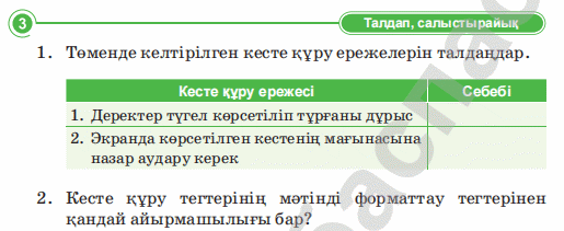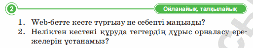 Дескриптор Web-бетте кесте тұрғызуы не себепті маңызды 2 балл Дескриптор: Төменде келтірілген кесте құру ережелерін талдайды 2 балл Дескриптор: -Блокнот программасында HTML файл мәтінін жазады 2 балл Дескриптор: Сұраққа жауап береді Дескриптор: Онлайн платформада сұрақтарға жауап береді 2 балл |