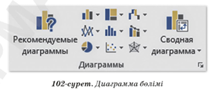 Жаңа сабақтың тақырыбын ашу. «Кинометафора» әдісі арқылы жаңа тақырыпты игерту. Диаграмма деген не? Диаграмма – сандық деректерді визуалды қабылдауға мүмкіндік беретін график түріндегі тәсіл. Диаграмманың қандай түрлері бар? Дигарамма түрлерімен танысу үшін қолданылатын деректерді ерекшелеп, Мәзір жолы – Қою(вставка) қатары – Құрал-сайманда тақтасынан – Диаграмма бөлімін таңдау қажет. (оқулықтағы 102 – сурет)