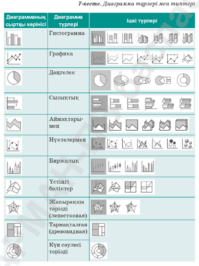 Барлық диаграммалар қатарынан кірістірілген графика түрлерін көруге болады, оларды тінтуірмен екі рет шерту арқылы қолдануға болады. (7 кесте)