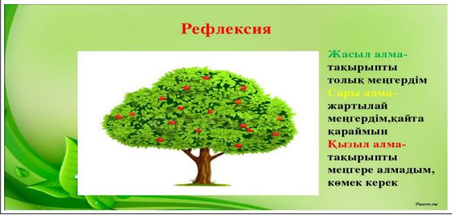 «Алма ағашы» әдісі арқылы рефлексия жасаймын. Оқушыларға сабақ барысында үш түсті алма беріледі. Сабақ соңында оны алма ағашына ілу керек. Жасыл түсті алма – тақырыпты толық меңгердім. Сары түсті алма – жартылай меңгердім, қайта қараймын. Қызыл түсті алма – мен тапсырманы орындай алмадым.