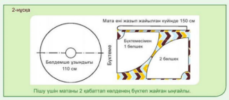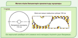 Тапсырма: Тігін бұйымын дайындау барысында матаны дұрыс таңдау өте маңызды. Бұйымды пішу алдында матаны дайындау қажет: 1. Матаның оң бетін анықтаңдар. 2. Матада ақаудың бар-жоғын тексеріңдер. 3. Матаны декатирлеңдер. 4.Түкті матаның түгінің жату бағытын анықтаңдар (барқыт, шибарқыт, мақпал). 5. Сурет бағытын анықтаңдар. Пішімді пішуге дайындаңдар: 1. Модель эскизіне сәйкес сызбаны модельдеңдер. 2. Пішімнің барлық бөлшектеріне атауын, бөлшек санын жазыңдар, бойлық жіп бағытын нұсқармен көрсетіңдер. 3. Әр қиықтың тігіске қосымша мөлшерін белгілеңдер (см есебімен).